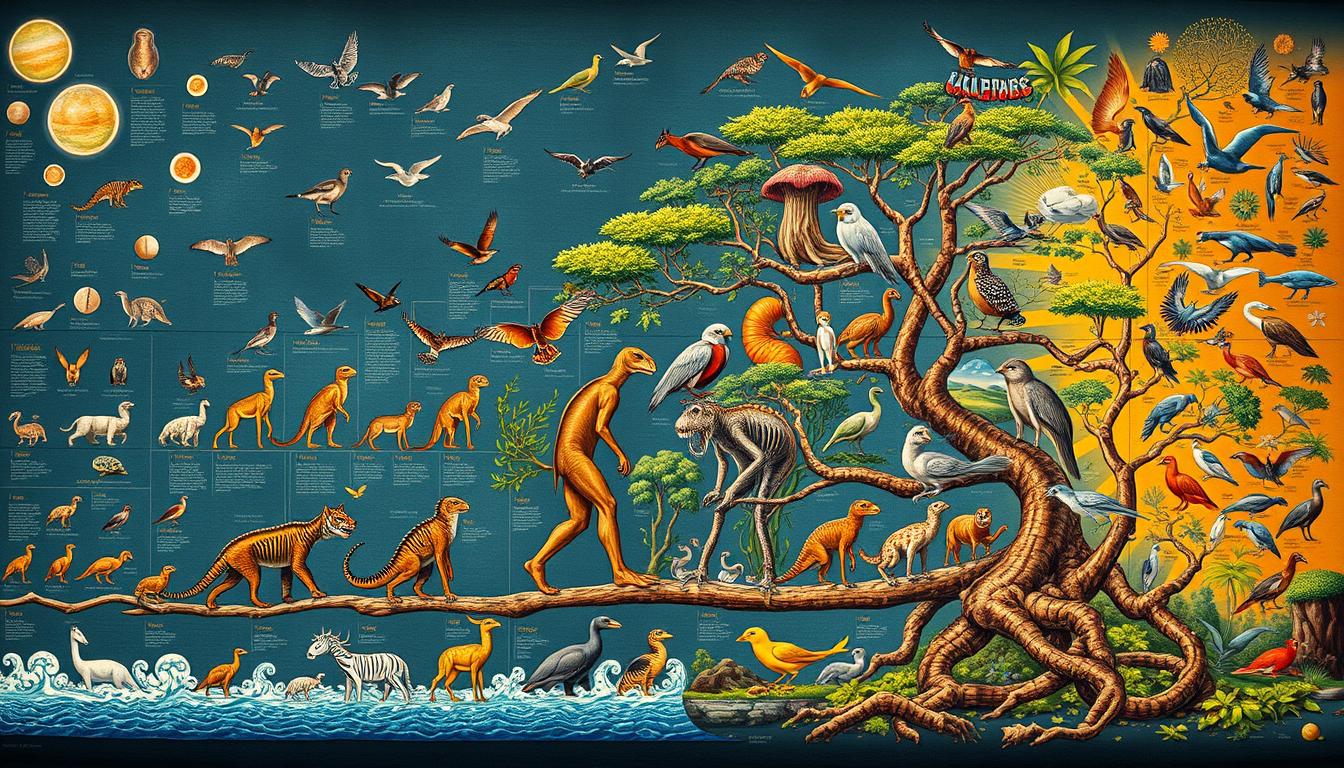 The journey of life on Earth is full of adaptation and change. From simple cells to the variety of species today, evolution is key. It shows how humans and animals have changed over millions of years.